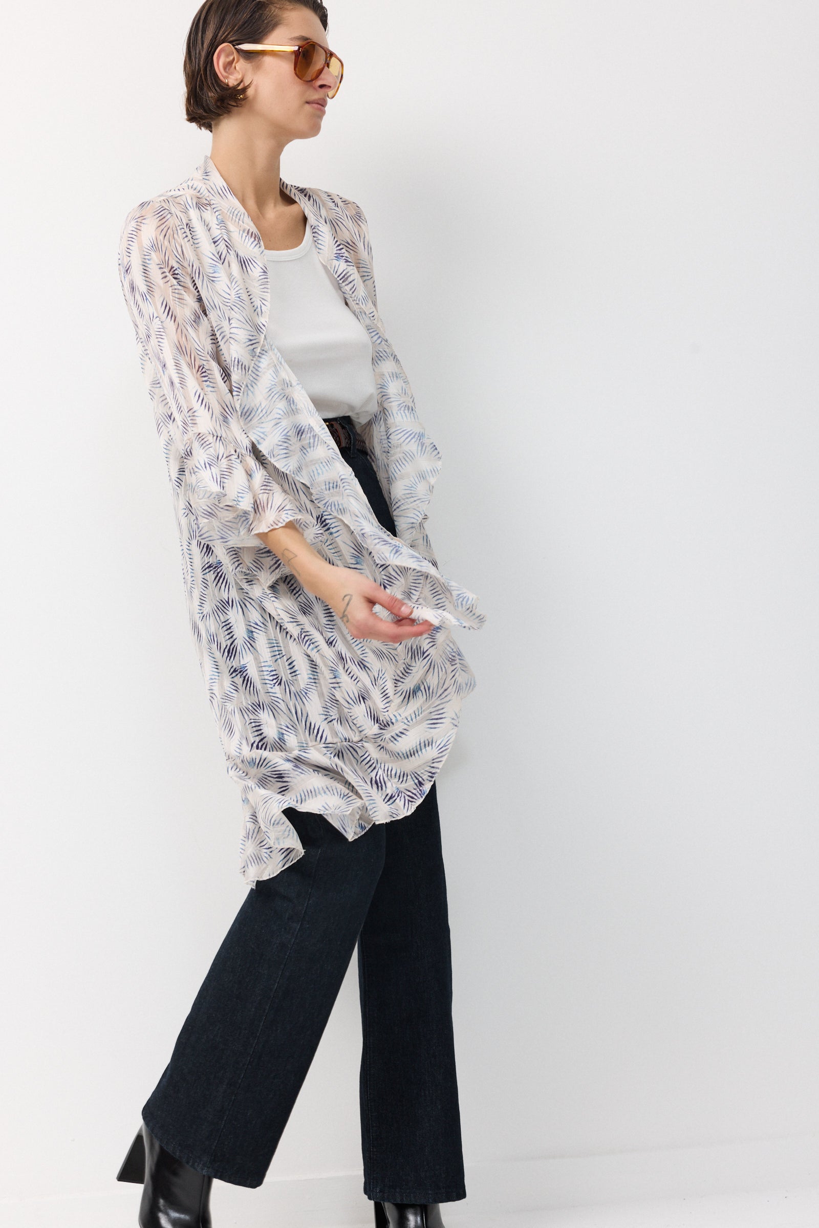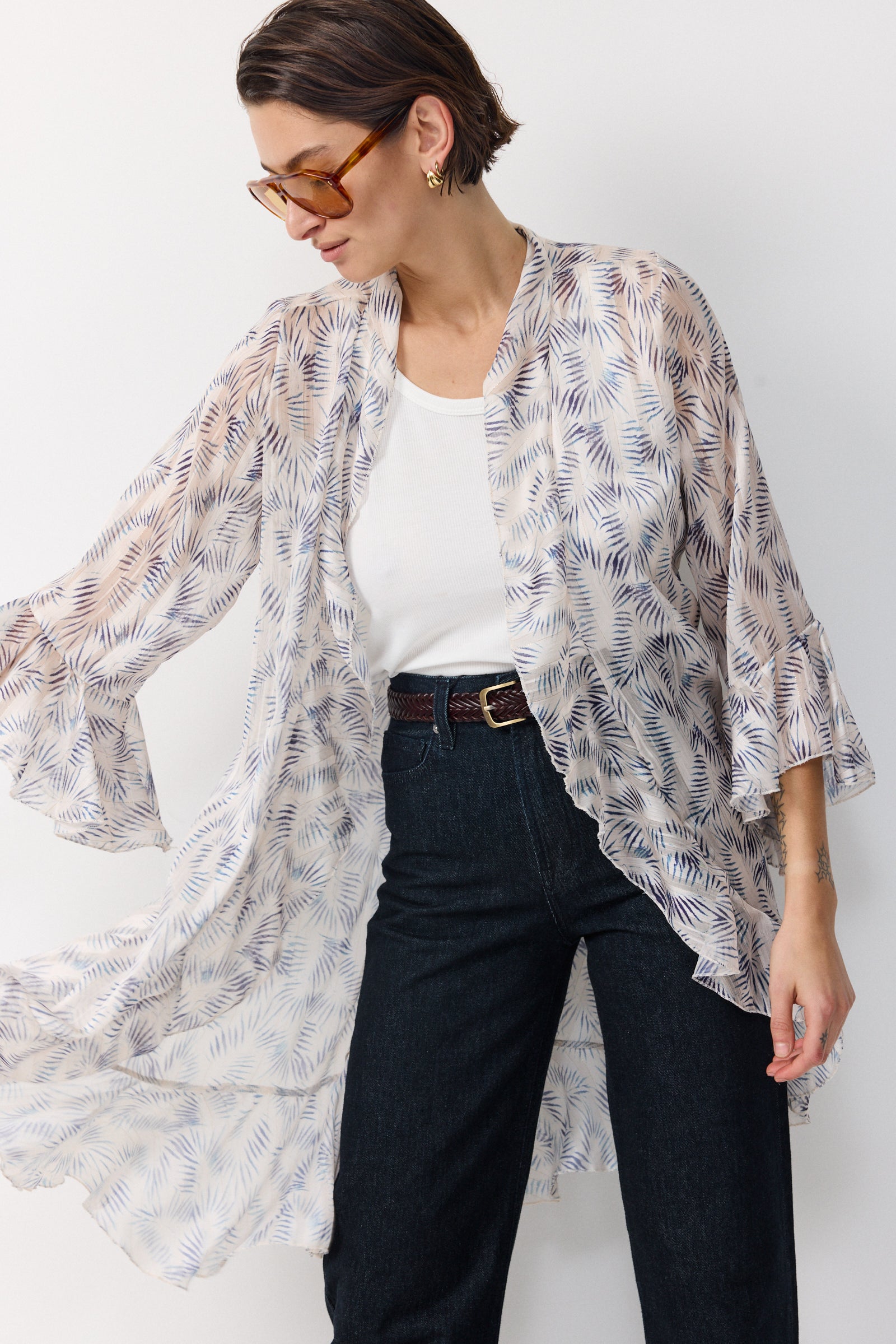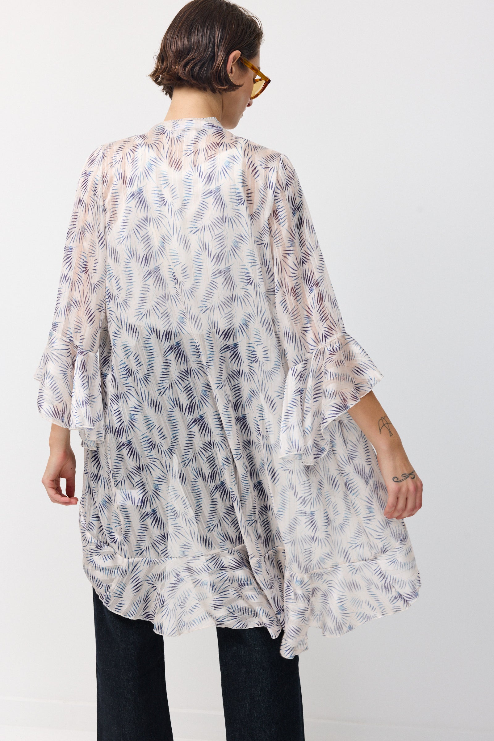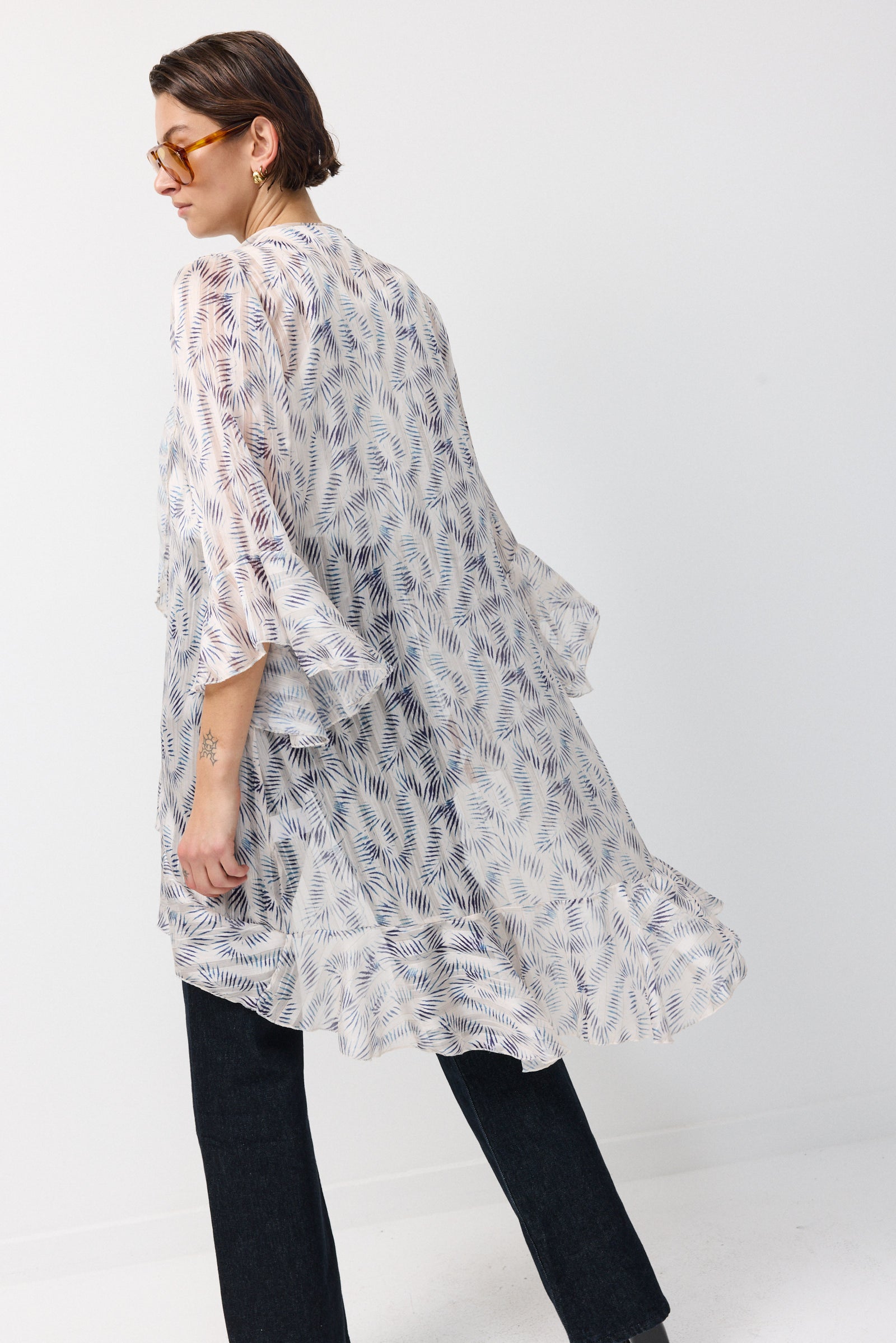 עליונית שיפון קלילה וחצי שקופה שופעת בד וגזרת וולאנים היוצרים מראה של ריחוף ותנועה מיוחדת של האריג