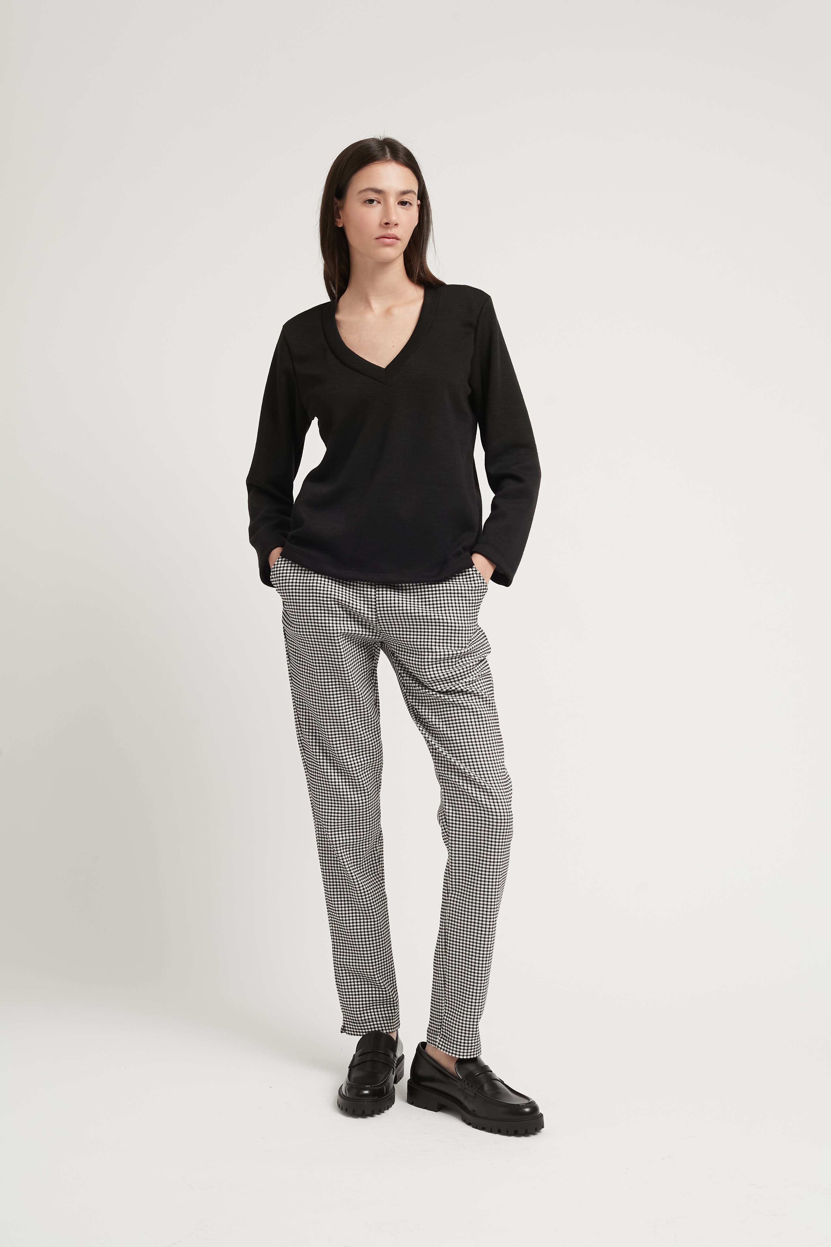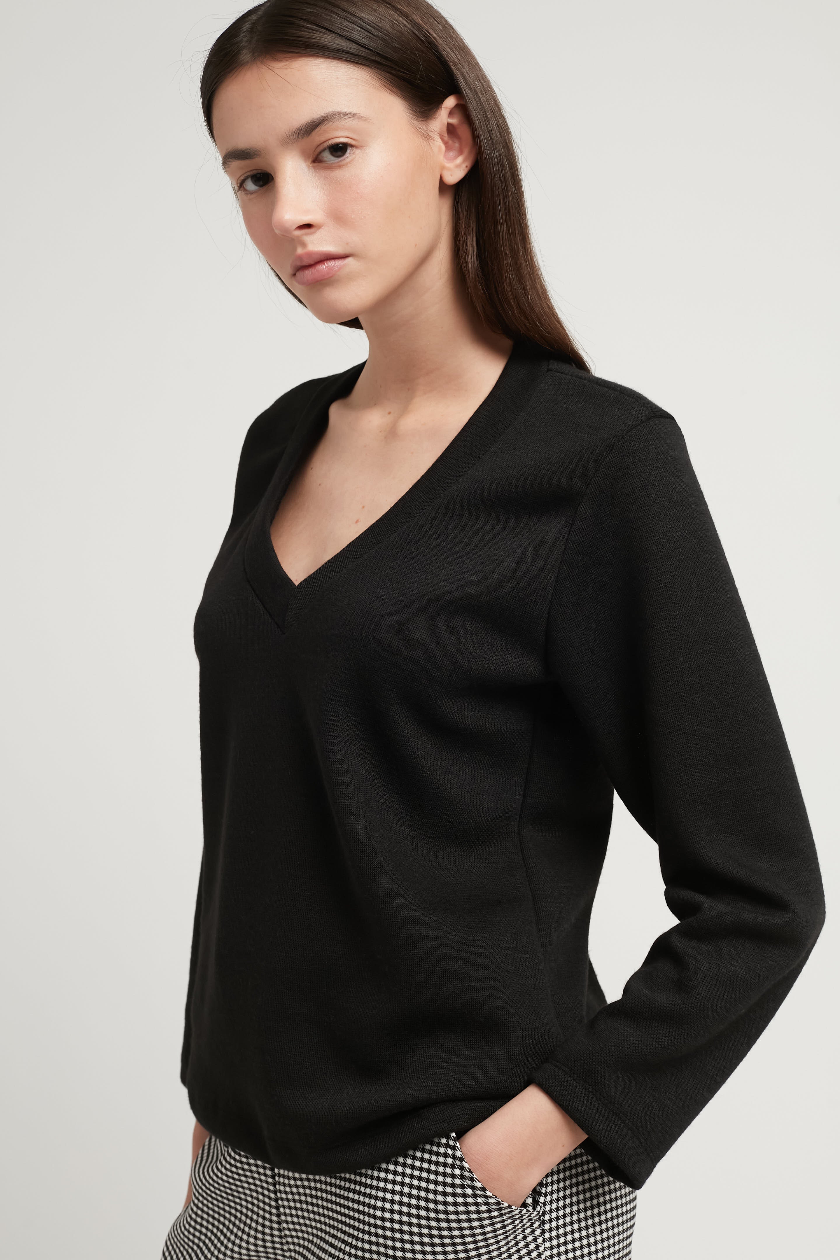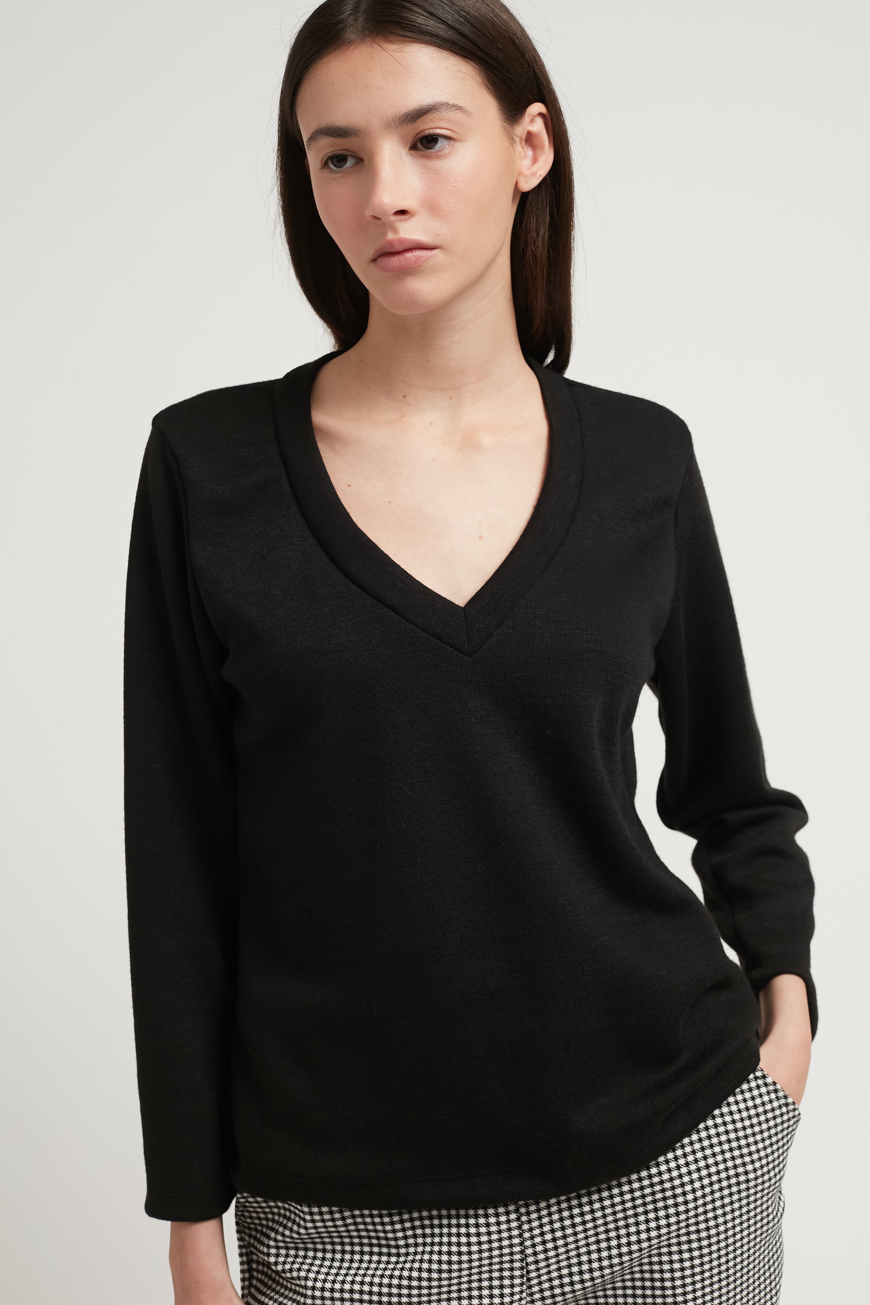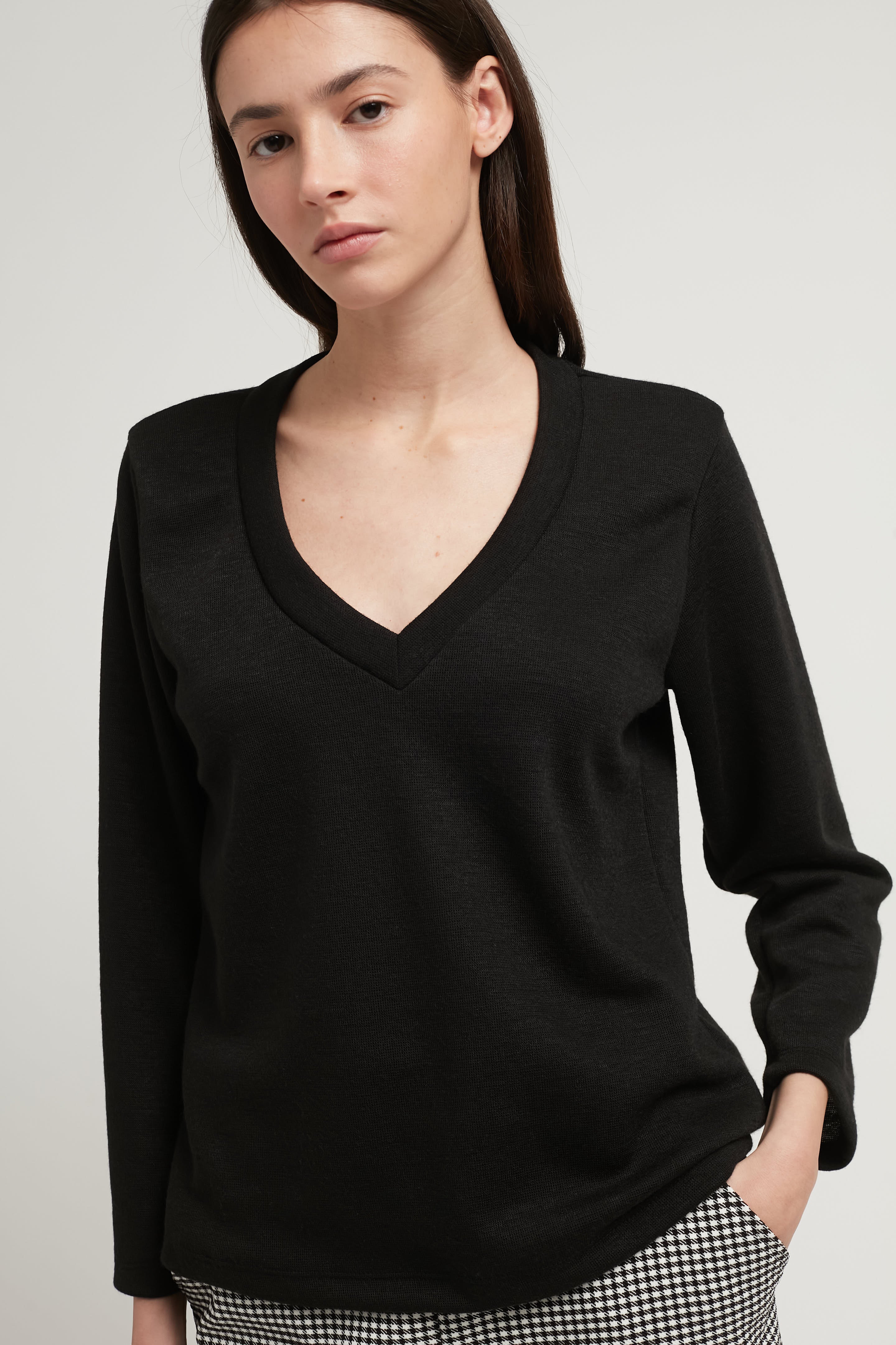 מחשוף וי מחמיא שאינו עמוק מידי ומכסה את קו חזיה ושרוולים ארוכים