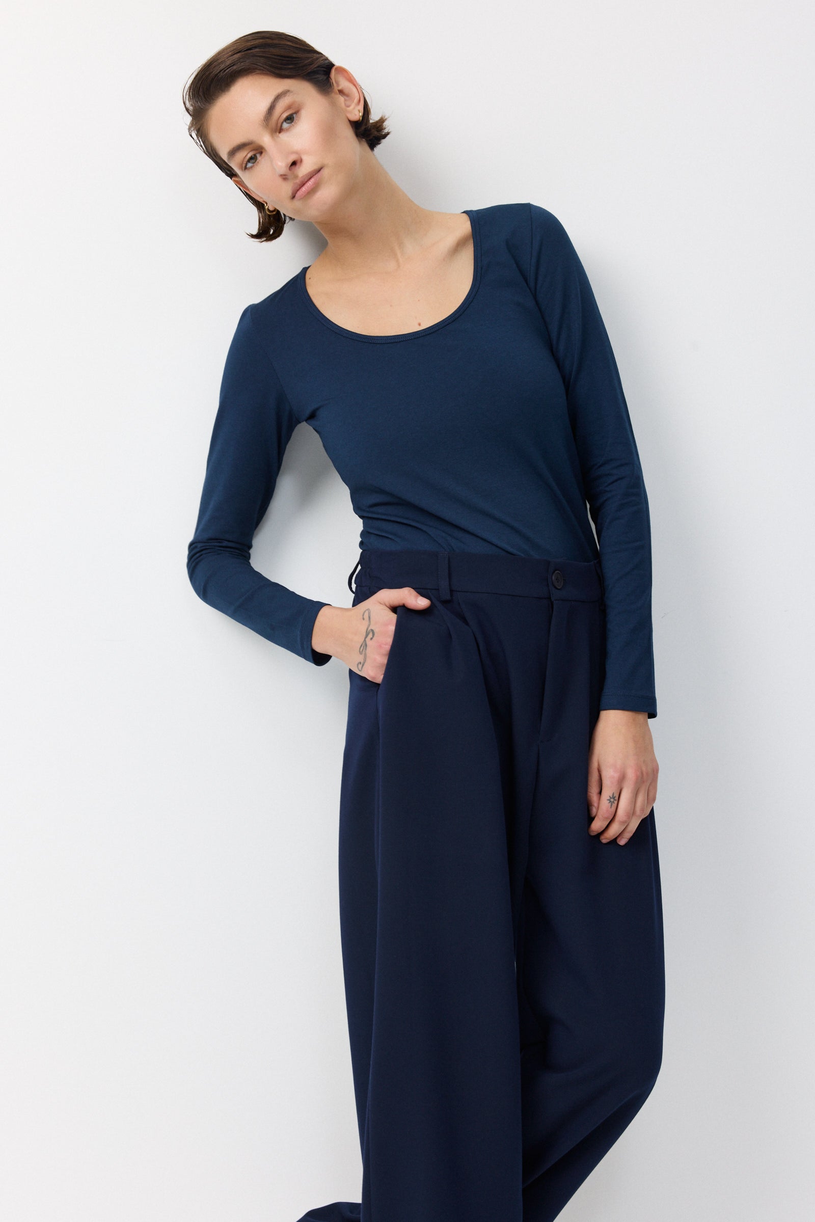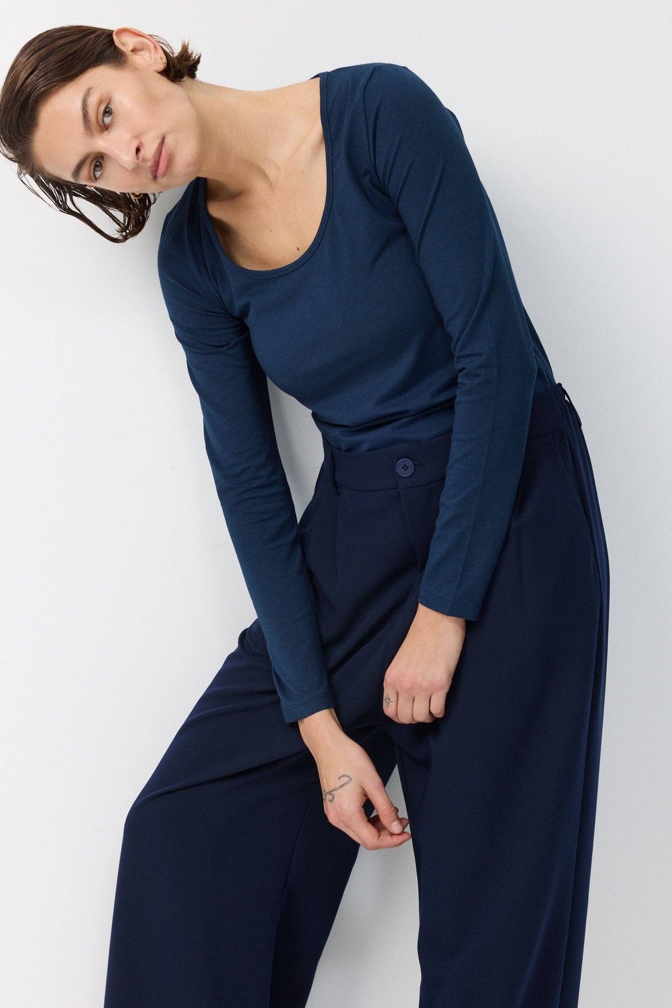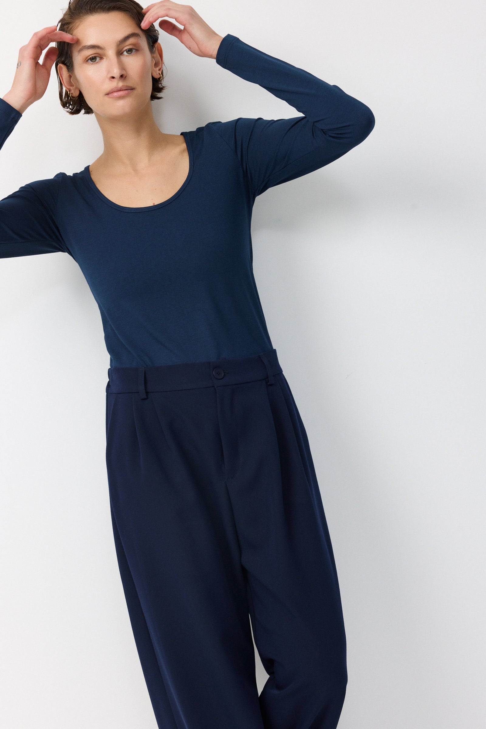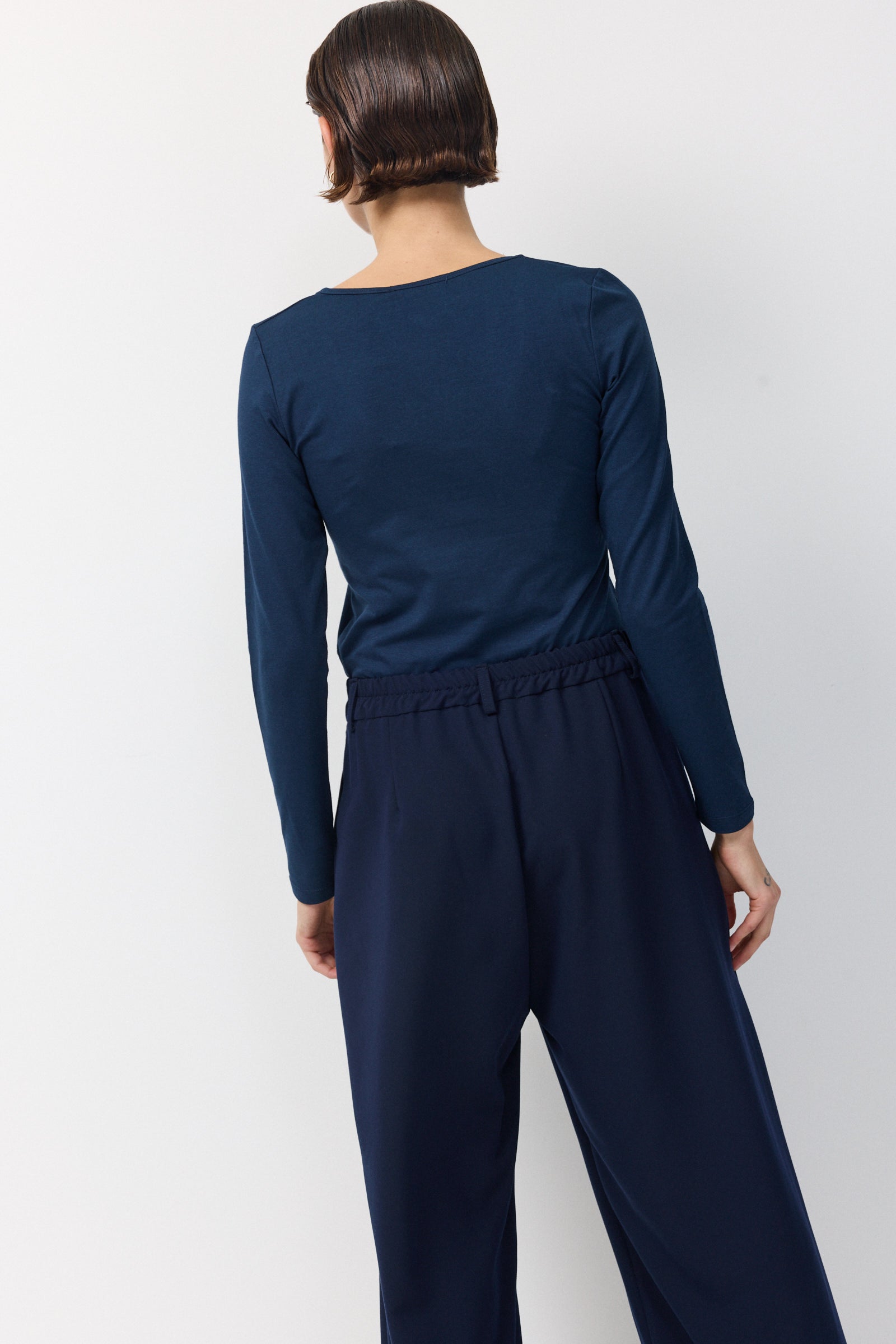 מכנסי אריג מחוייטים בגזרת רגל ישרה-מתרחבת קלות