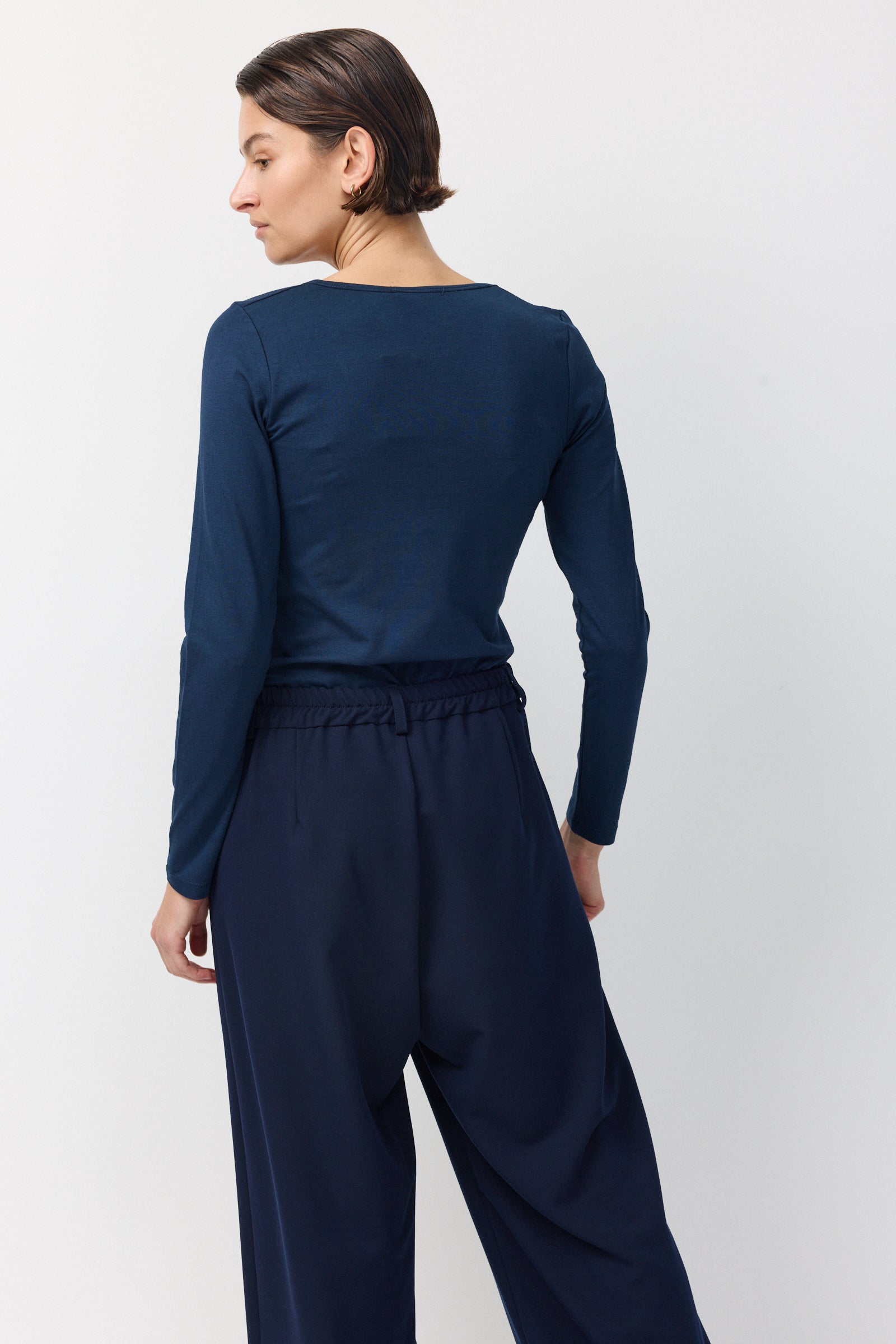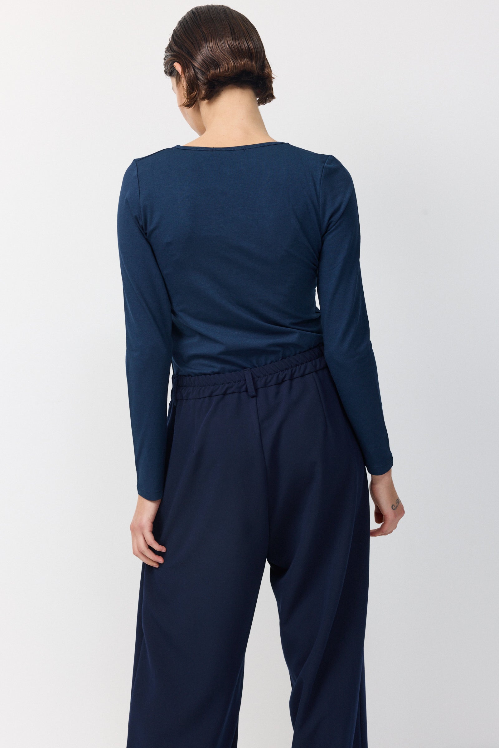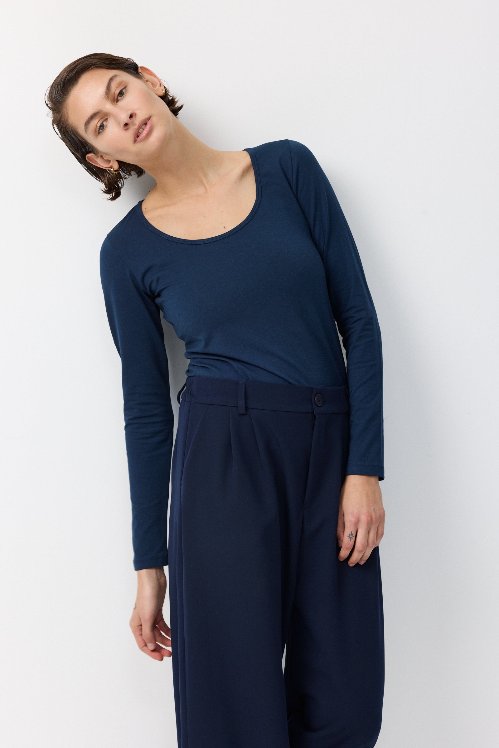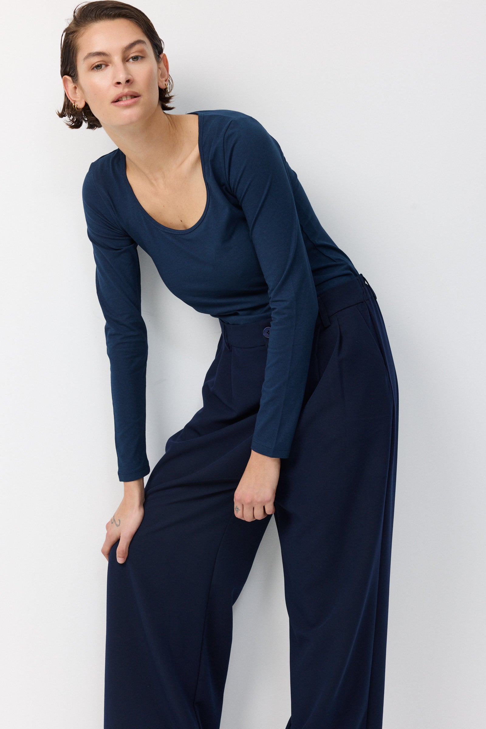 מכנסי אריג מחוייטים בגזרת רגל ישרה-מתרחבת קלות