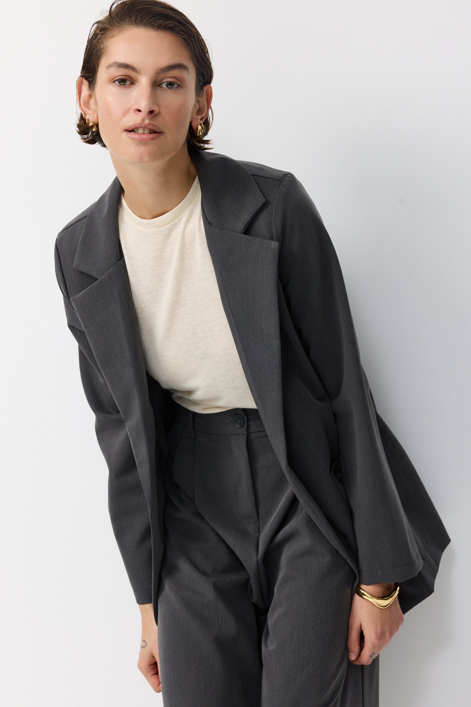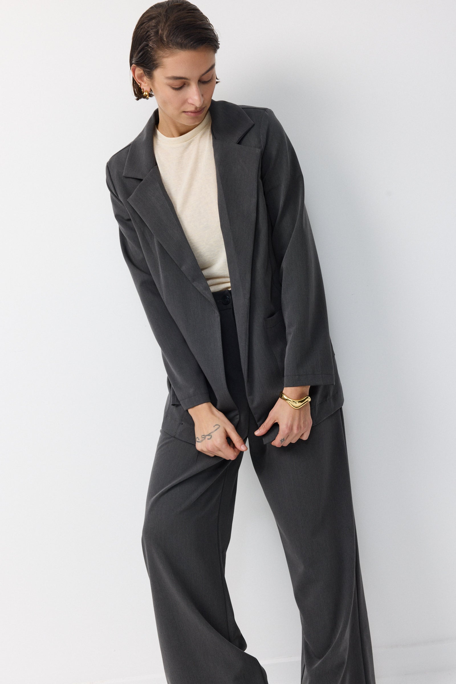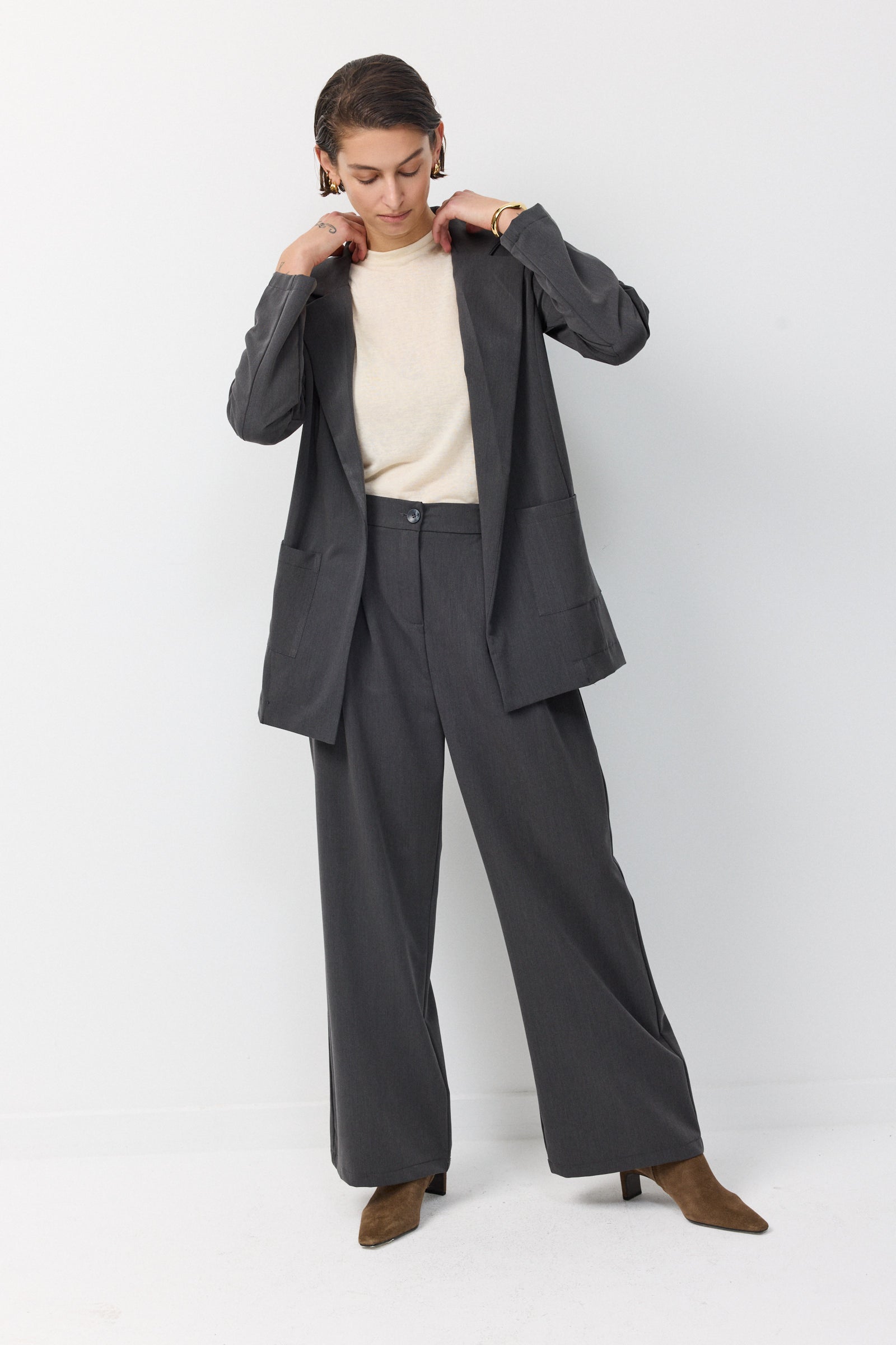 לשילוב עם מכנס החליפה התואם או כל מכנס מחויט חלק או גינס