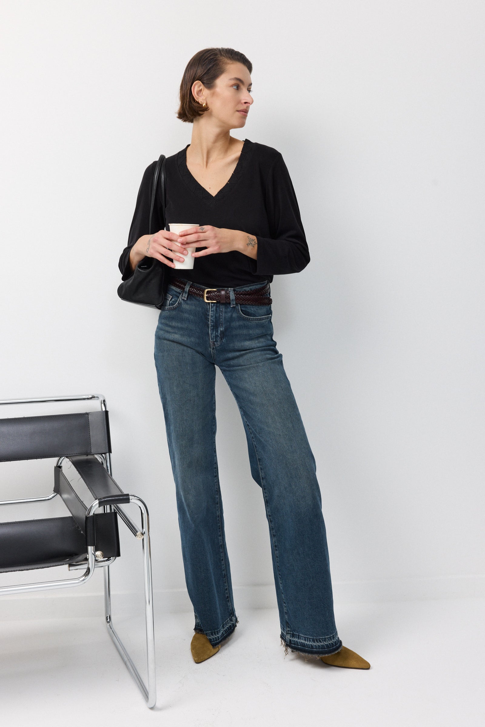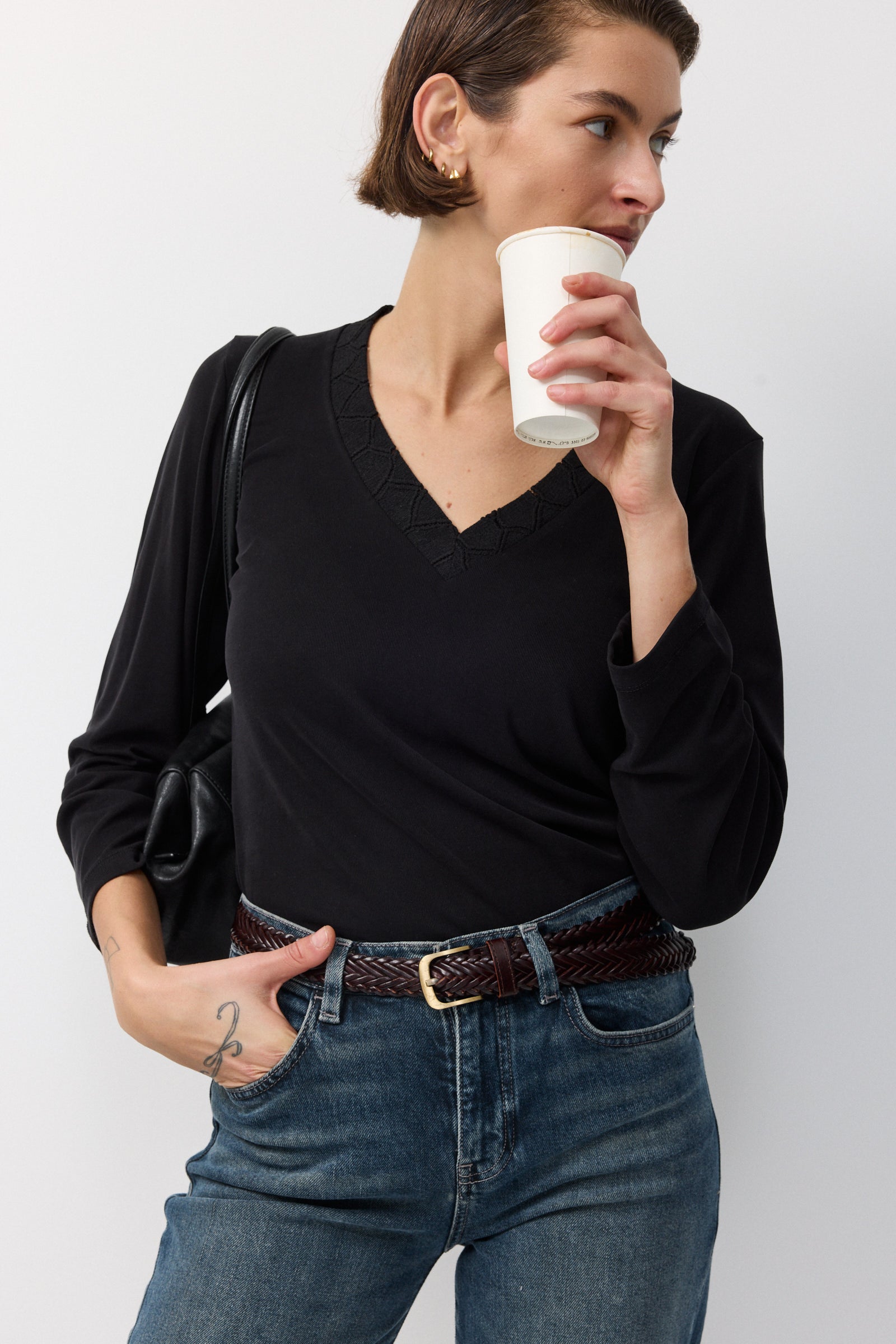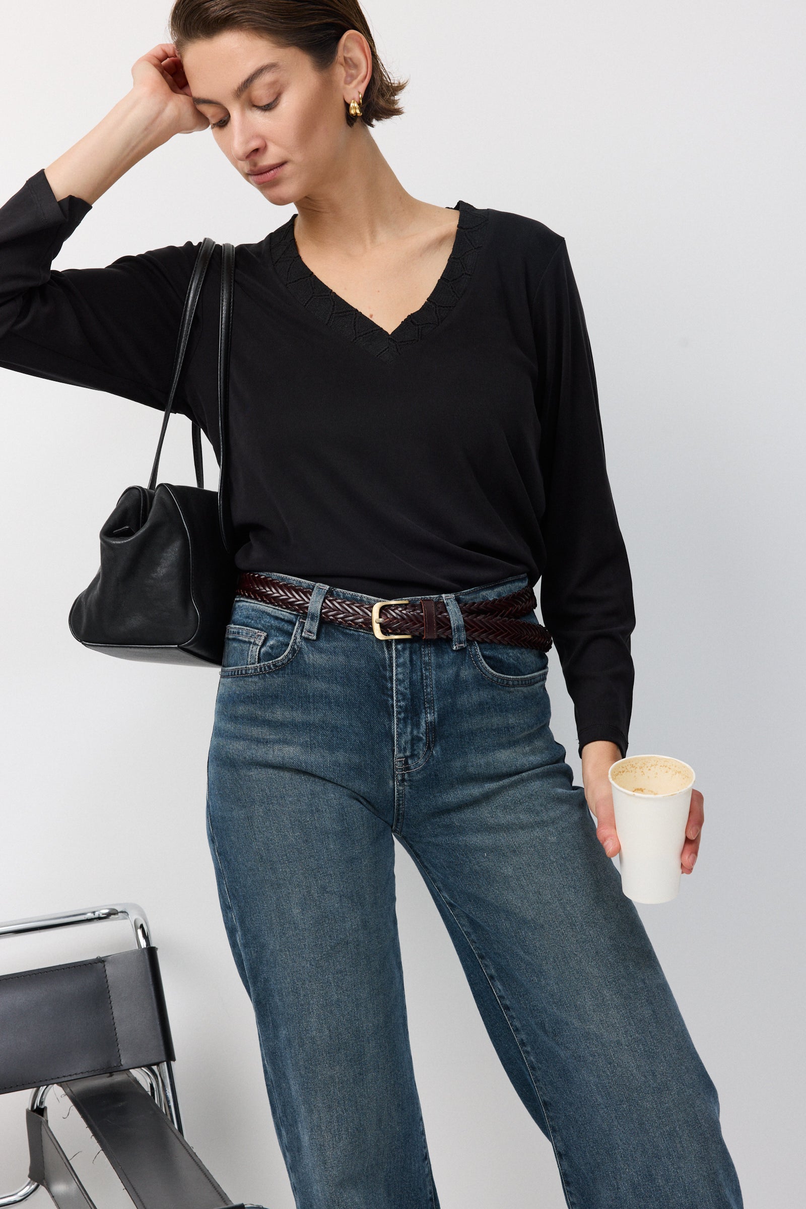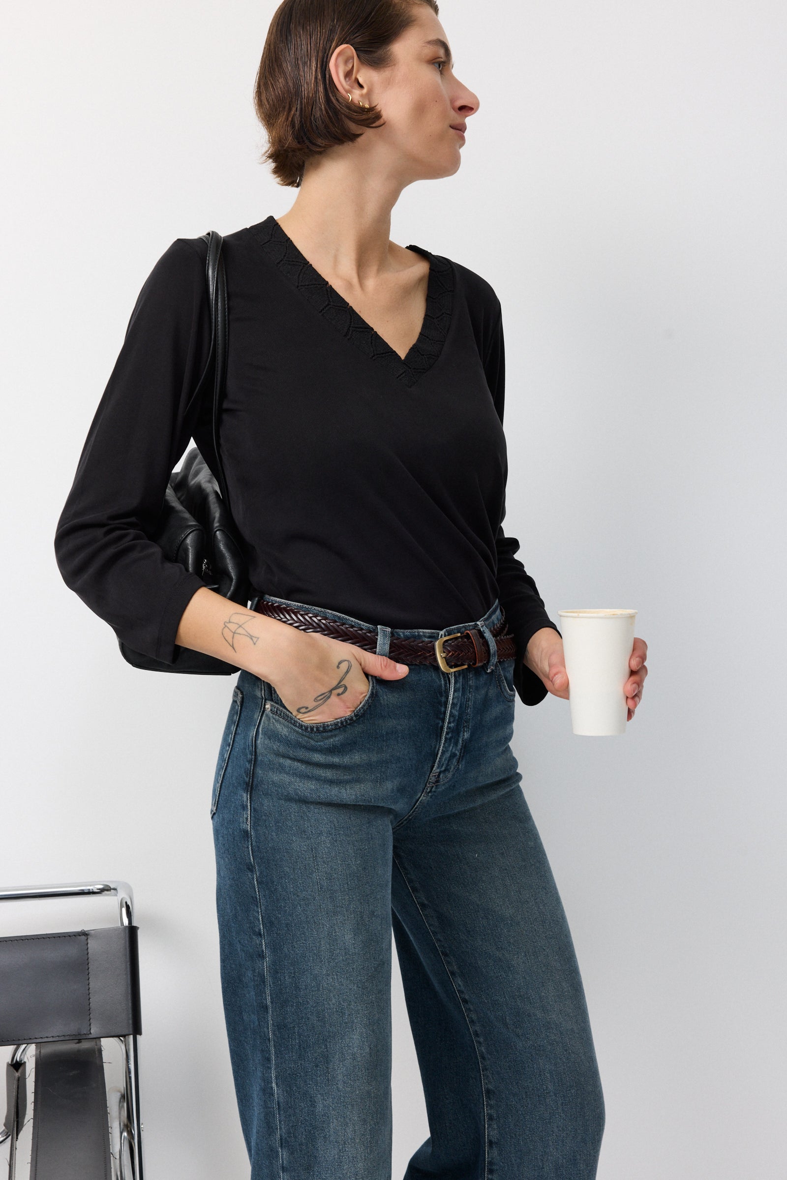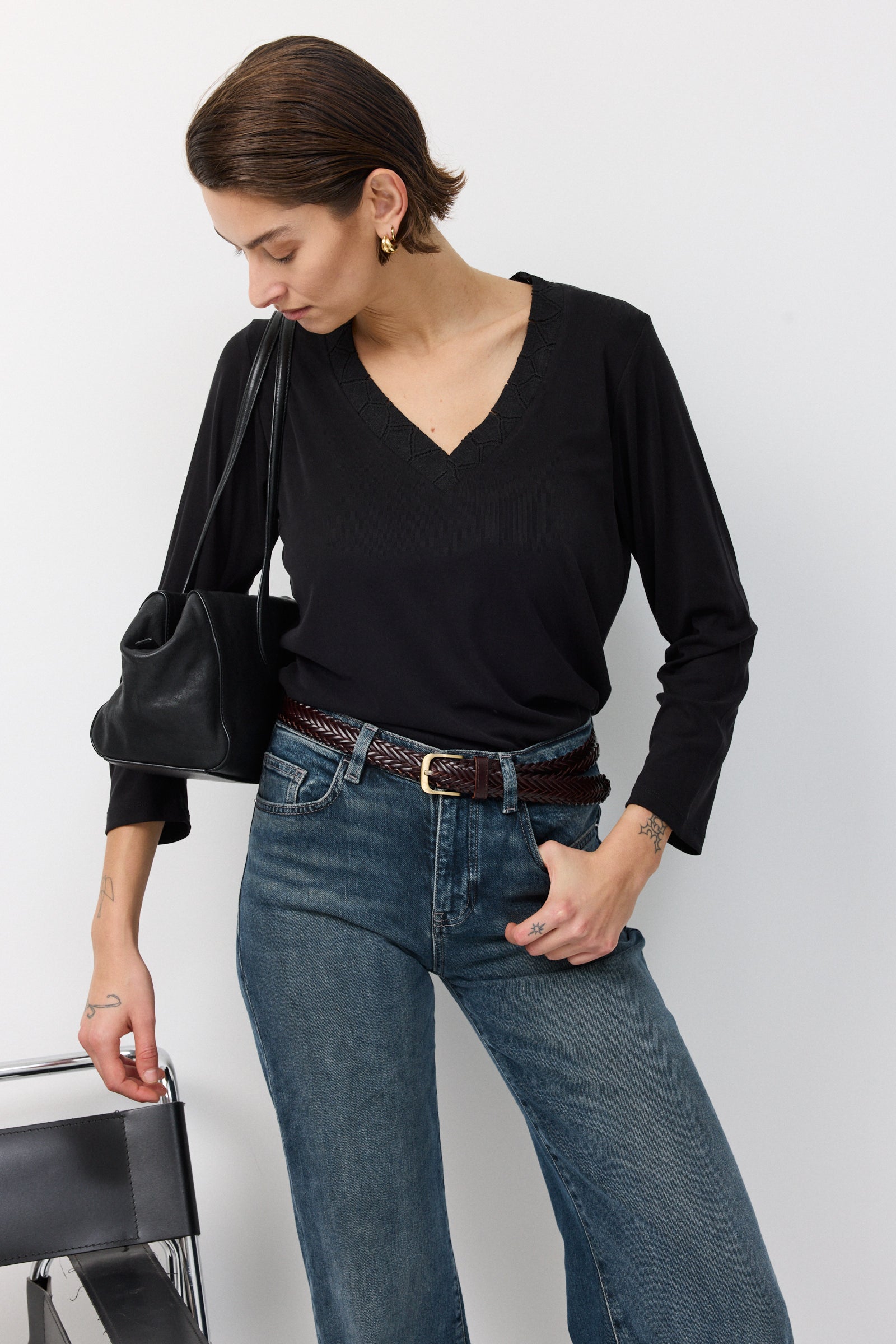 בגזרת וי שרוול ארוך מלא ומחשוף מתופרת מסגרת של בד קרושה באותו גוון של החולצה כתוספת מעניינת שמוסיפה אדג' לגזרת הבייסיק