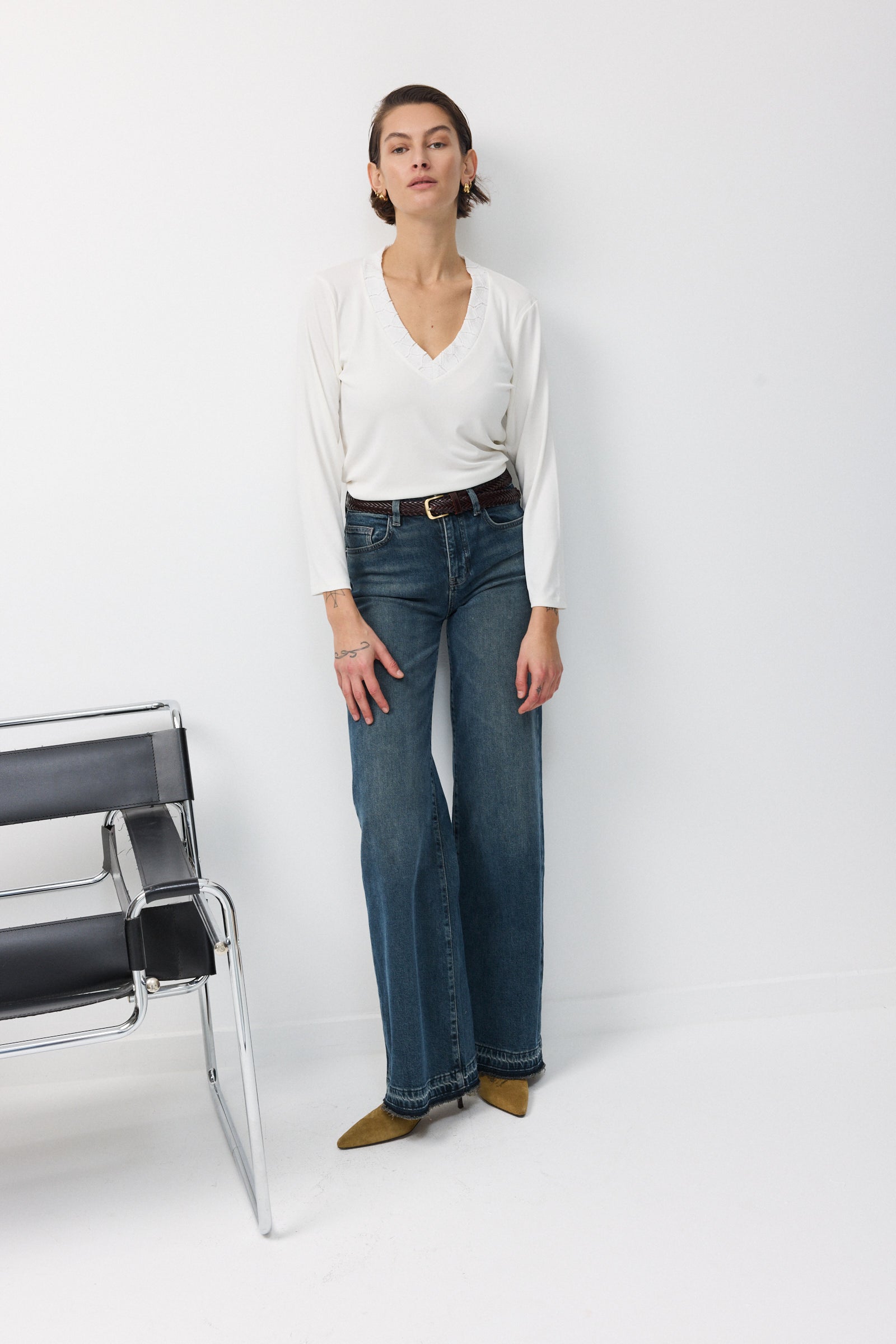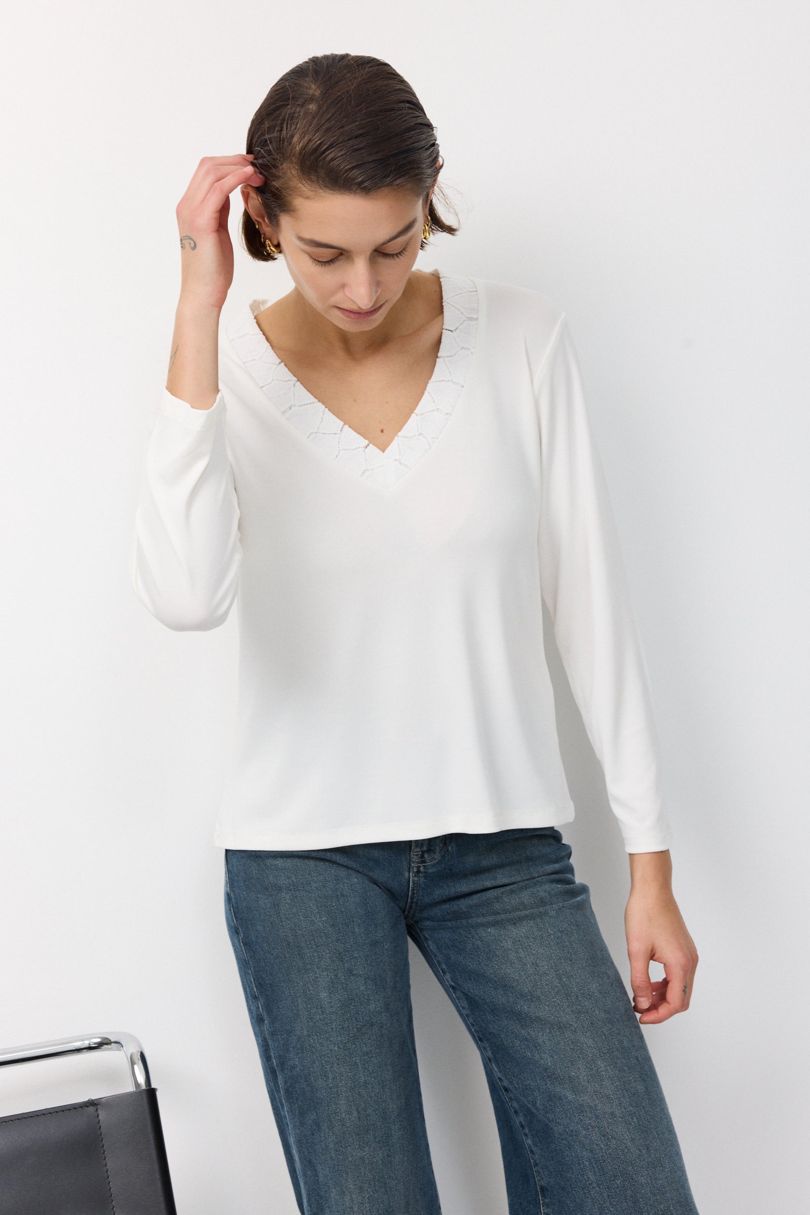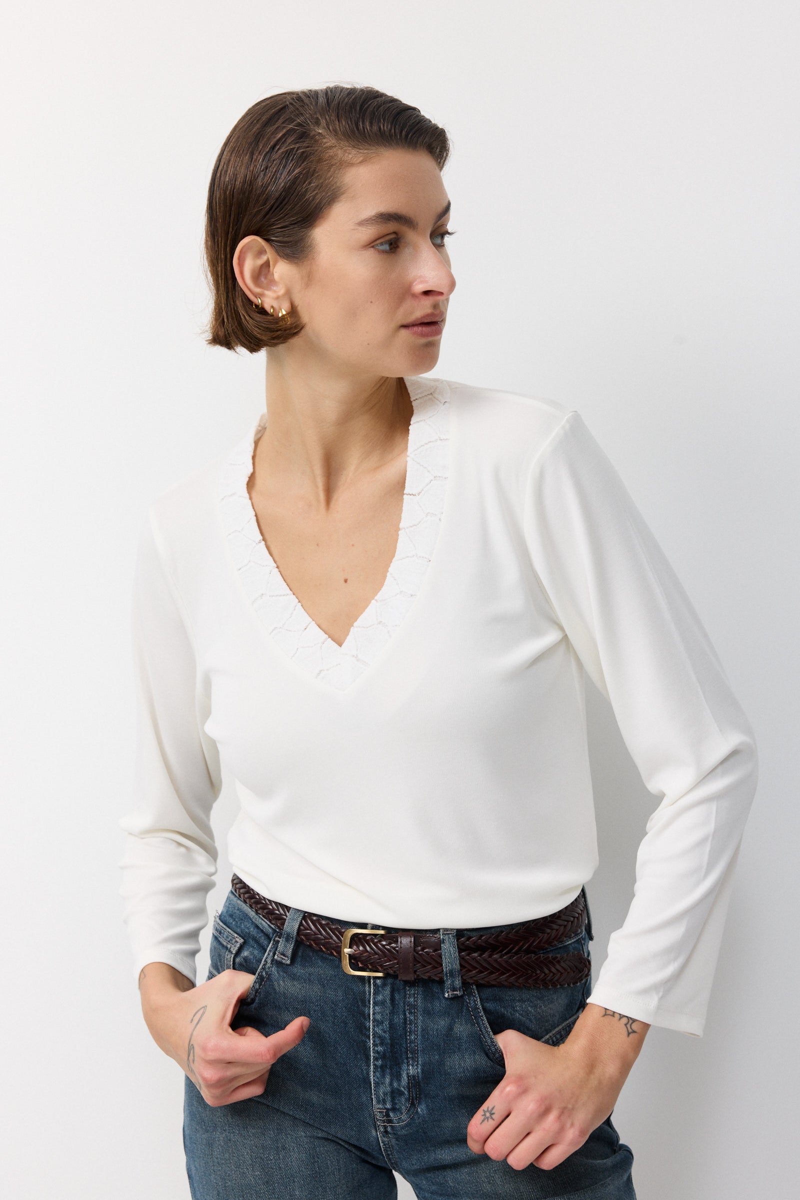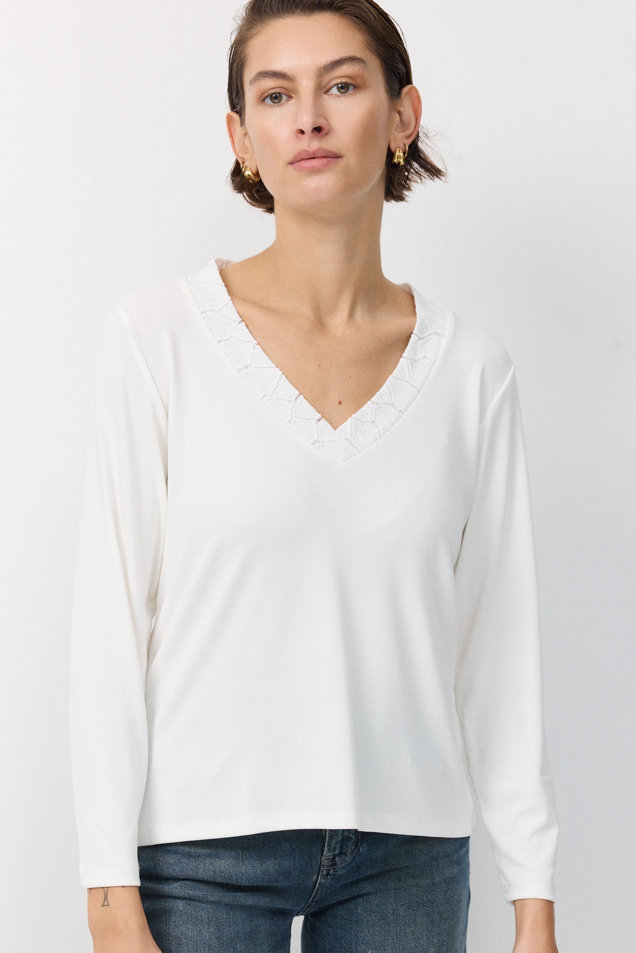 בגזרת וי שרוול ארוך מלא ומחשוף מתופרת מסגרת של בד קרושה באותו גוון של החולצה כתוספת מעניינת שמוסיפה אדג' לגזרת הבייסיק